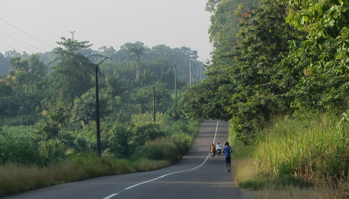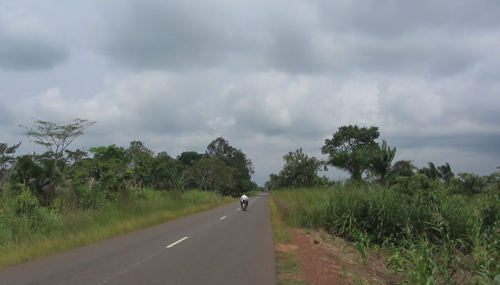 この辺の道は結構山道になっていて、チャリ走りにはちょっとシンドイ。ただ、そんなシンドイ山道がスポーツ走りを求めるサイクリストにはぴったりらしく、途中、ロードバイクで走るサイクリストたちに何人も出会った。そういえば、ロードバイクでひた走るサイクリストに、西アフリカではあまり出会ってこなかったような気がする。人民チャリに乗って町移動する人たちにはたくさん出会ってきたのだが。