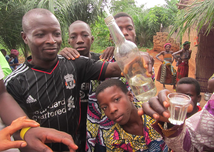 そんな、写真撮りテンションがようやく落着きをみせ、そろそろお別れをと思ったところで、「旅人が訪れたら、酒を振舞うのも、わが村ではしきたりの一つででしてな」と村長が、めっちゃアルコールが濃そうな蒸留酒を出してきた。