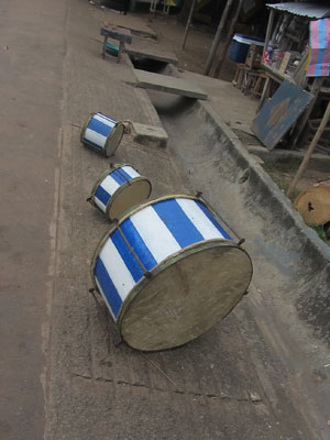 さて、そのままトーゴ道を走り続け、とある村を通過する際、道端にマーチドラムタイプの太鼓が並べられているのを発見。どうやら、太鼓屋さんらしい。おお、トーゴの太鼓ってどんな感じなのかいな、と覗いてみることに。まぁ、太鼓屋さんといっても、オープンスペースに太鼓が並べてあるだけの場所なんだけどね。そこには、水色をベースにカラフルに色塗られた深胴タイプの片打面太鼓がいくつも並べられていた。うむむ、トーゴ太鼓は、ジャンベとはまた違った感じなんだな。実際どんな感じで使われるのか見てみたいなぁ、なんて思いながら、この店を後にして走り始めたところ・・・