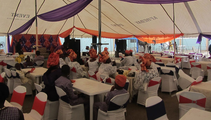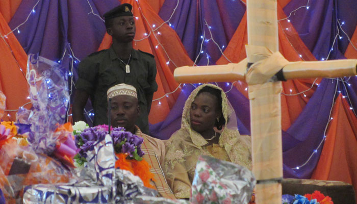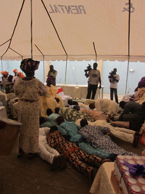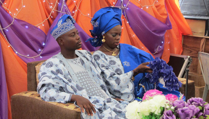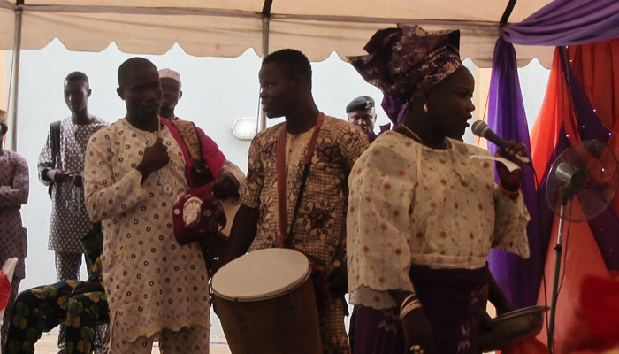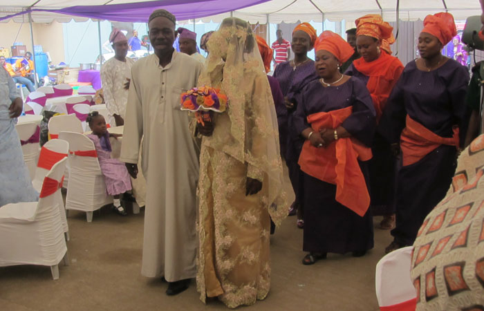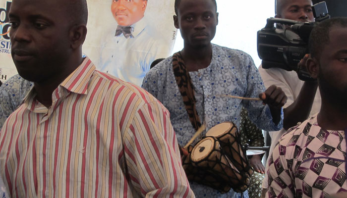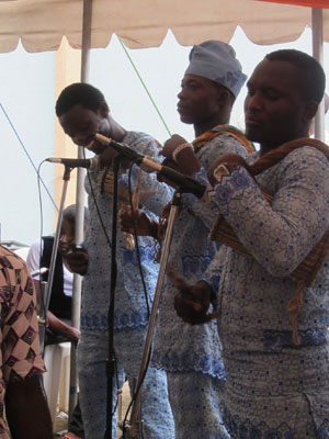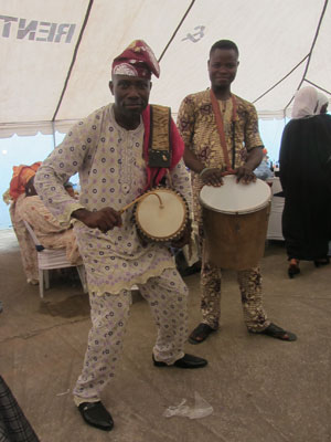 さて、始まったイスラム形式のヨルバ風結婚式。コーランの長々しい朗読から始まって、堅苦しい感じのオープニング。子供達なんて、寝ちゃったりして・・・オイラも、正直退屈で、生あくびをかみ殺しながら、座ってた。う~ん、今日の結婚式は、ずっとこんな感じでダラッと進行していくのかなぁ、だとしたら結構ツライなぁ、なんて思っていたのだが・・・新郎新婦が入場した途端、トーキングドラムとミニチンバウという打楽器コンビが、会場内を練り歩いて、ビートで場を盛り上げていき、やっぱりいつもの、陽気なアフリカ特有の自由な感じになってきた。うんうん、この感じ、とオイラも気分が上がってきたところで・・・前方に特設されたステージ上で、バンド形式の音楽演奏が始まった。