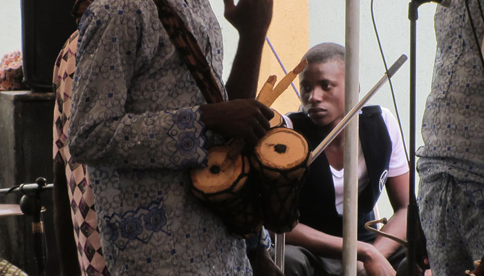 さて、フジ音楽を演奏するバンドを見ていたら、ひとつ見たことのない面白い楽器が演奏されていた。実は、ブラジルサルバドールで一緒にカーニバルを堪能したラテンパーカッショニストのタツヤさんから「キューバのバタっていう両面ドラムの元になったという打楽器がナイジェリアにあるそうなので、ぜひ見てきて下さいね」と言われていたんですよ。ナイジェリアのこの打楽器は、結構小さくて、しかも、打面をヘラで叩くという独特のものだった。実際のキューバのバタは、もっとでかくて両面を素手で叩く。ん、ひょっとしてこれが?・・・と一瞬思ったものの、さすがにコレは違いすぎるよなぁ、と思ったのだが、なんと、コレが、バタの原型パーカッションだった。うむむ、これがバタの原型だよ、と言われなかったら、とても関連ある楽器には見えない。海を渡り、長い年月を経ることで、こんなにも大きく変わってしまうっていう事実が・・・とても興味深い。