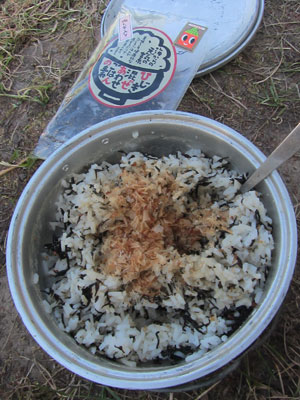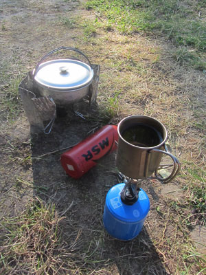 朝、米を炊きながら、隣でお湯を沸かす・・・あれ?ガスバーナーなんて持ってましたっけ?と突っ込む方は、昔からのオイラの旅ファンの方ですな。ええ、これまでオイラは、ガソリンストーブだけでやってきたんですよ。が、ベルリンで、カズくんがカズストーブも併用して持っていて、やっぱりガスは楽で便利ですよ、と言って、実際使いこなしているのを見て、持っているのもいいな、と買っちゃったんですよ。確かに、ガスストーブは楽で便利。ワンタッチで火はつくし、ススとか出ないから、後片付けも楽チン。
