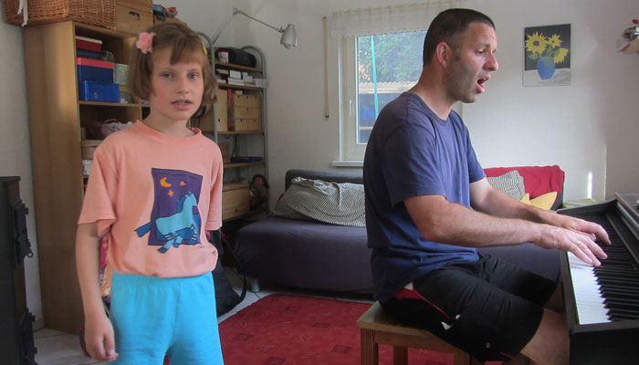 とりあえず、庭にテントを張らせてもらった後、「一人増えても同じだから」ということで、夕食をご馳走になることに。で、夕食前、ピアノに座って、素敵な演奏をしはじめた、おじさん。そして、それに合わせて子供達が合唱。