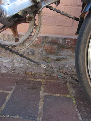が、張り替えたチェーンの一箇所が変な状態になってまして。せっかく新しいチェーンにしたというのに、ギアが空回りしたりして、前よりもひどい状況に。これは困った、と、走り始めてすぐ、近くにあった町の自転車屋に寄って、見てもらうことに。「あ~、これは、一つがつぶれちゃっているね」といわれ、そこの部分をとってしまい、つなぎパーツでつなぎあわせることに。