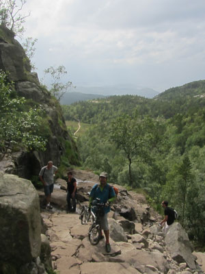 でも、無理と言われると余計燃えちゃうオイラ。そのまま相棒を担ぎ続けて・・・ええ、岩場だらけの山道なんで、一箇所も乗れる場所なんて無いわけですよ。「こんなところじゃダウンヒルもできないし、なんのために自転車もっているの?」なんて聞かれたりして。