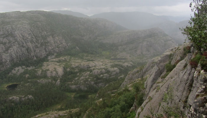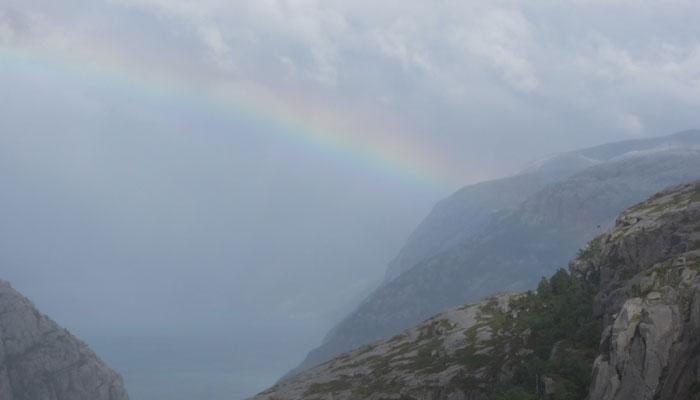 さて、そんな感じでめっちゃ苦労して登ったというのに、プレーケストーレンに到着した時には、周囲には濃霧が立ち込めているし、雨まで降っているという最悪の天気状況。なんだよぉ、と嘆いていたのですが、よくよく見ると、雲は流れていて、時々青空が覗いている。