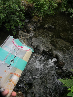 茹でたそうめんを上流に投げる・・・が、そうめんにそれなりの重量があり、沈んでしまう。小川の流れは上面はそれなりなのだが、下の方はそんなに流れていないらしく、進みが遅い。のろのろと流れてくるそうめんを箸でつまみ、ツユにつけて食べる。