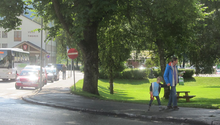 1時間ほど待ったら雨が小雨になってきたので、出発。Vossの町に到着する頃には雨はすっかり止み、雲も晴れて太陽がのぞくようになっていた。このコロコロ変わるノルウェーの天気。いやぁ、付き合うのは大変ですよ。どうせ、この太陽も長続きしないはず・・・