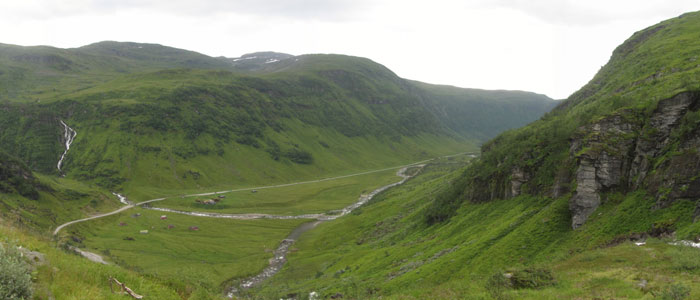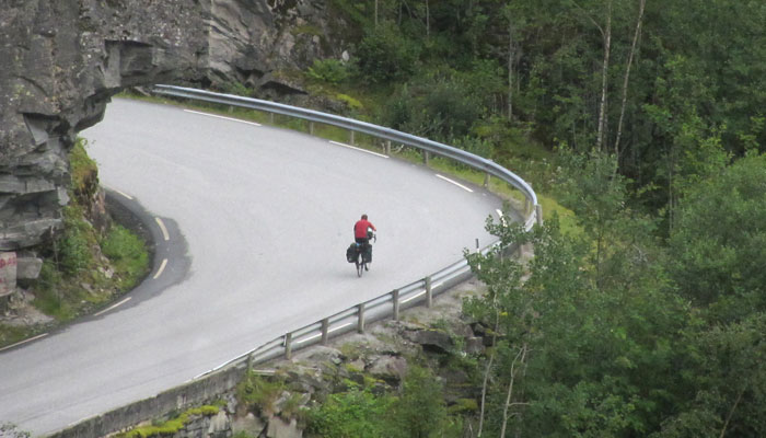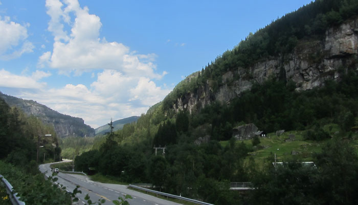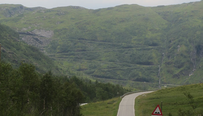 さて、Vossの町は特に用事がなかったので、そのまま素通り。しばらく走っていたら、目の前にドンとそびえる山が見えてきた。まさかあれを上らせるなんてことはしないだろ、きっと迂回道があるはずさ、と思いながら近づいてみたら・・・そのまさかだった。<Z字>を二つくっつけたカタチのヘアピンカーブの道がそびえ立つ山に刻まれているじゃないですか。