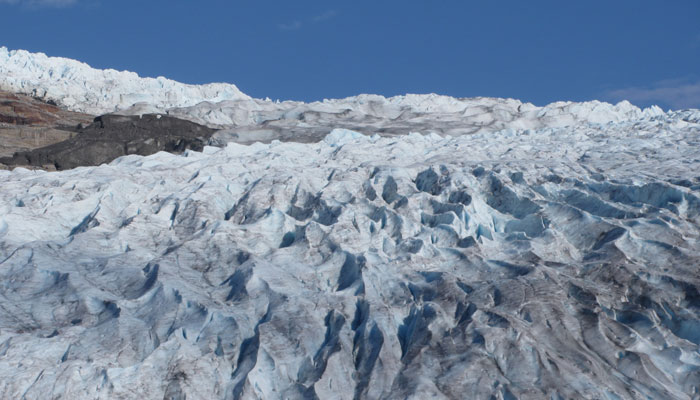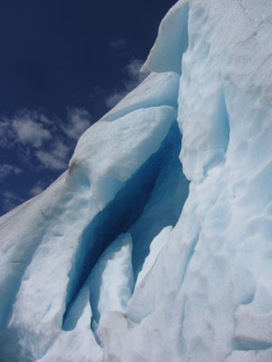 もちろん、氷河も素晴らしかった。太陽光の下で見る氷河は見事に氷河ブルーに輝いていて。で、真下まで行こうと思ったのだが、この氷河、近づけば近づくほど、上からポロポロと氷の塊が降り注いでくる。氷河ってやっぱり河なんですよ。ただの氷の置物じゃないんです。動いているんです。なので、下手に氷河に近づくと、突然割れた氷に巻き込まれるなんて危険性がないわけじゃない。ということで、チェルおじさんが、「それ以上は行くな」っていうところまで、近づいて・・・氷河鑑賞終了。
