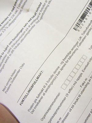 が、郵便局で確認してもらったところ・・・荷物はまだココにはないと言われまして。どうやら、オイラ宛の荷物、オスロの税関で停められちゃったらしい。で、税関としては、中身が何なのか、そしてその値段はいくらなのか教えてくれないと、そちらへは引き渡せないので、至急、中身に関する情報を教えて欲しいとのこと。今日到着した紙はそのことをお知らせする紙だったのだ。