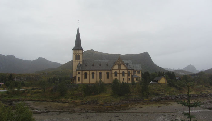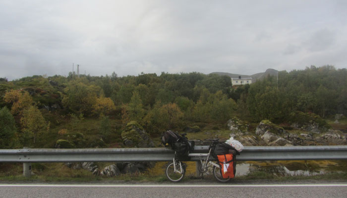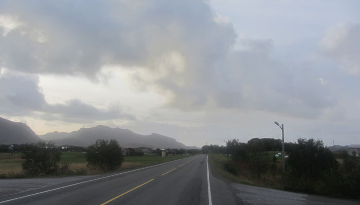 が、雨が降り始めちゃうと、慰めどころじゃなくなりまして。今日のゴール地点と考えていたスヴォルバーの街に到着するちょい前から、雨が降り始めてしまった。そして、スヴォルバーの街に到着する頃には土砂降り。あ~、もうこんな雨の中走りたくね~。ロフォーテンは昨日の走りで十分満喫したから、もういいか、バスに乗って一気にワープしちゃおうか、と考えはじめるオイラ。
