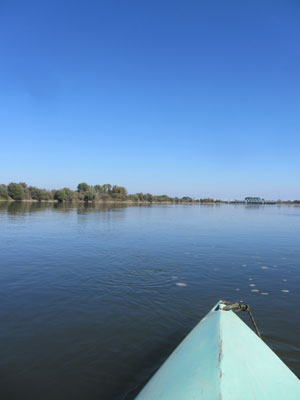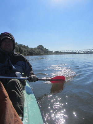 青空の下での川下りは、格別だった。これまでの3日間とは比べ物にならないくらいの心地よさ。目に映るものが全てキラキラしてみえる。暖かくなってきたから、漕ぐのをやめて、周囲の風景を堪能する余裕もできたし。今までは、カラダを動かしていないとすぐに寒くなってきてしまっていたから、とにかくひたすら漕ぎまくってて。手を休めて周囲の風景にノンビリ浸るなんてことができなかったんですよ。