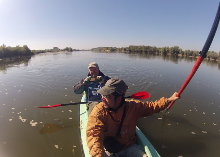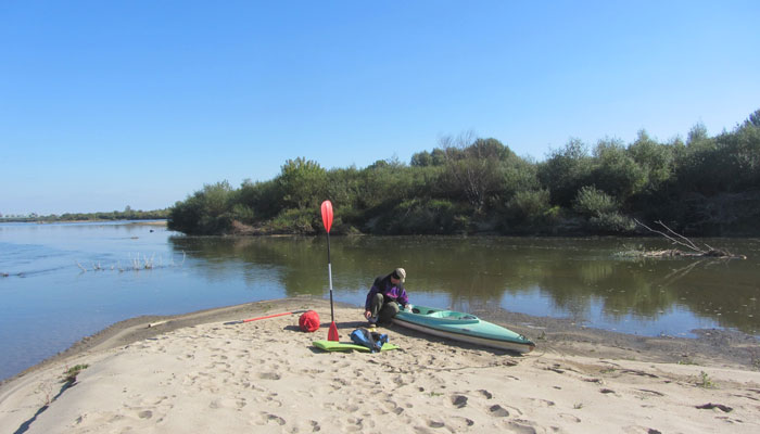 しかし、こんなに晴れた日は、寒いのは朝だけ。すぐに、ポカポカ陽気になってくるはず。澄み渡った青空が気持ちいいし、これだったら、まだまだカヤック旅を続けたくなっちゃうなぁ、なんて思ったのだが、残念ながら、今日が最終日。新たに設定したゴール地点までは、あと20kmほど。順調にいけば、今日の昼には到着するだろう。
