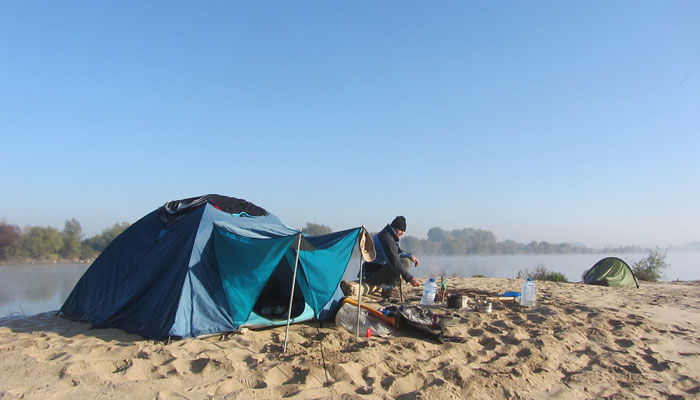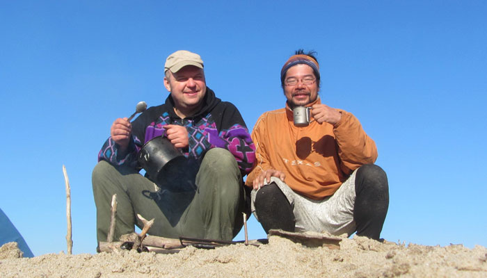 朝、寒さで目が覚めた。今日は特別に寒い。いつものように、火を起こすためテントを出たら・・・外は快晴。川下りを始めて、初めて見る雲ひとつない青空が広がっていた。ちなみに、朝の気温ってやつは、曇りの日より晴れの日の方が低いことが多い。放射冷却ってやつですわ。