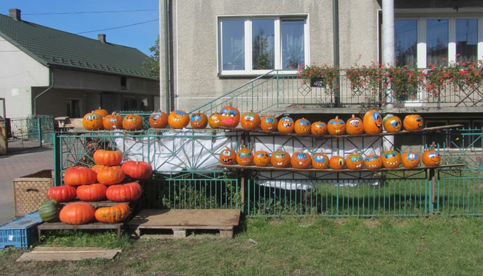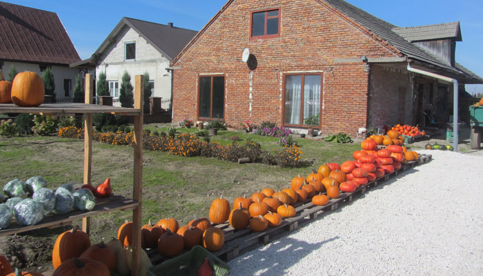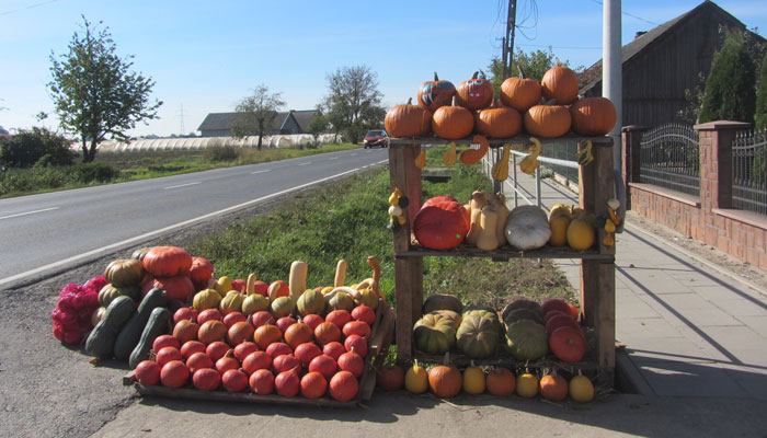 で、走り始めたポーランド道。目の前には、ずっと、ノンビリした農地風景が広がっていた。そして、道端には、あちこちに採れたての野菜が並べられ、売られている。そんな野菜の中でも特に目に付くのは、カボチャ。そうか、もうすぐハロウィンだ・・・