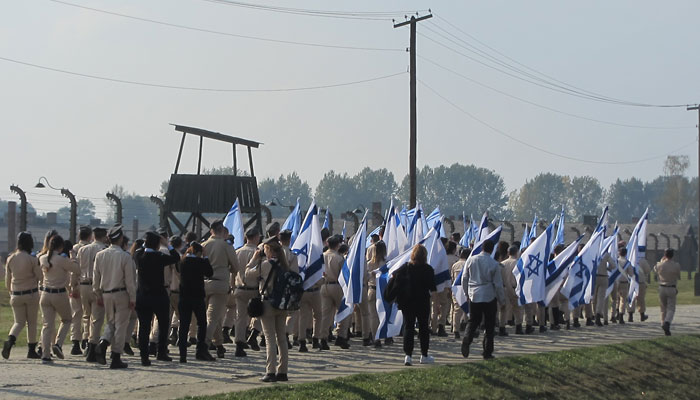 アウシュビッツ=ビルケナウ強制収容所に収容され大量虐殺された人たちの多くは、ユダヤ人だった。そのユダヤ人の国家<イスラエル>。彼らが、イスラエルの国旗をかざして、ココを行進する意味。考えれば考えるほど、重い。