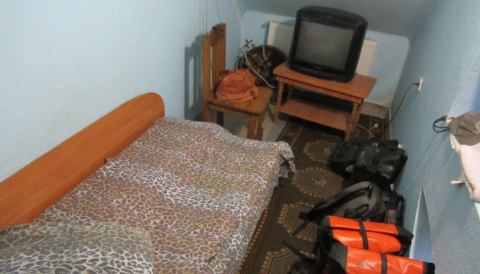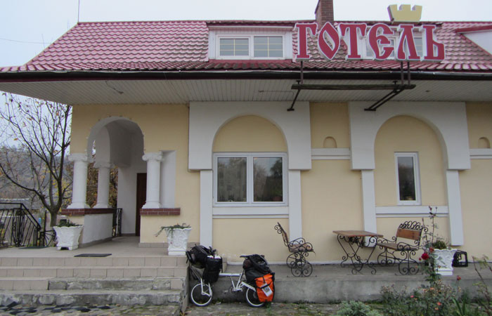 さて、夕刻に小さな町に到着。ここを抜けるとしばらくは町はないようだ。町を抜けたら人っけはなくなるので、道端で野宿してもいいかな、と思っていたのだが、ちょうど、町外れに、ホテルを発見。一応値段を聞いてみたところ・・・なんと、一泊50グリブナとのこと。しかも、部屋はシングル。うむむ、リヴィウの宿は、ドミで一泊100グリブナだったのに・・・半額でしかも、シングルって。