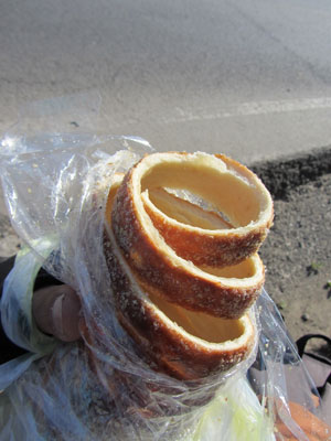 ちなみに、このクルクルパン、これまた、コンちゃんから後で、教えてもらったのだが、ハンガリーの名物らしい。ルーマニアのこの辺で売られているのは、ここがもとハンガリーの地だったことを示す光景。うむむ、確かに、これまでのラテンなルーマニアを走っている時には、クルクルパンは、全然見かけなかった。人々がおとなしい、旧ハンガリー領の地域に入ってから、急にクルクルパンの出店が目に付きだしたのだ。