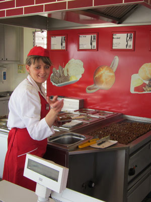 大きな町ブラショフに近づいてきたためなのか、道を走っていると、道脇に、いろいろな出店をみかけるようになった。で、小腹が空いたオイラは、買い物をしようと思い、スーパーに入ろうとしたところ・・・スーパー入り口の前に、<Mici>と書かれた屋台を発見。ここで、ジュージューと、美味しそうに肉を焼いていたのですよ。あまりに美味しそうだったので、一皿頼んで、食べてみたら・・・