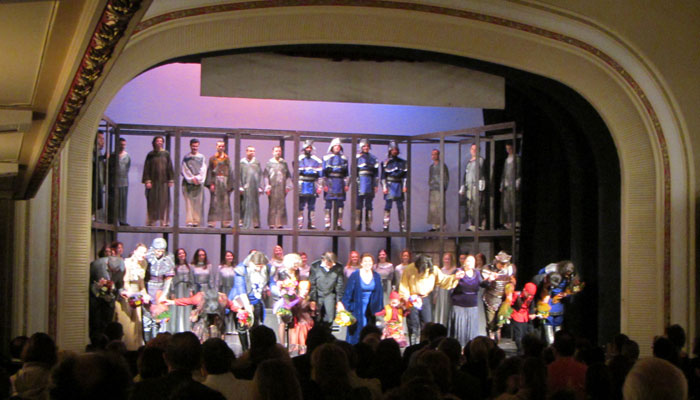 そして、1幕2舞台構成で、4幕まであるこの話。とにかく長い。18時半から始まって、終わったのが、22時。1幕終わるごとに休憩を挟むとはいえ、3時間半の長丁場。ひたすら、歌が歌われ続ける。
