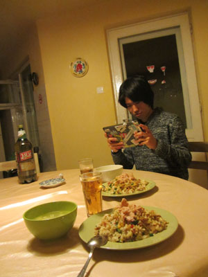 そんな外に、出かけていっていたヒロキくんが、「外は寒すぎます。新しくダウンを買ってきちゃいました」と、半額セールで買ってきたスキー用のダウンを嬉しそうに着込みながら、夕刻戻ってきた。そして、「飯は・・・?」というので、夕飯の支度を開始。スーパーの惣菜ばかりを食べていたヒロキくんの食生活をみかねて、「夕飯作るけど一緒にどう?」と声をかけたのがきっかけで、毎晩一緒にシェア飯をすることになりまして。といっても、料理はあまりやらないというヒロキくんは見ているだけ。オイラがいつもより大目に、いつもの飯を作って、テーブルに並べる。