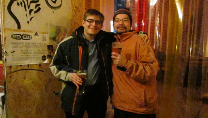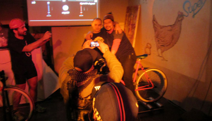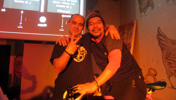 さてさて、店内は、さすが、自転車好きなブダペスト・バイク・マフィアの人たち行きつけの店だけあって、店の一角では、自転車レースが展開されていたりしてまして。刺青大男のダニーさんに引っ張り出され、オイラも飛び入り参加することに。で、オイラの相手は、ブダペストのトップ・メッセンジャーとのこと。一日に自転車で300kmも走る走りのプロの彼に、当然オイラは勝てるはずはなかったのだが・・・お情けで勝たせてもらったりしちゃって。