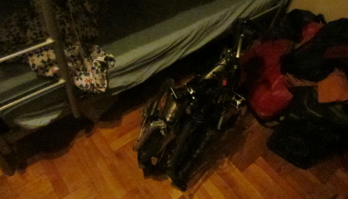 そんなハッピーなパーティーが終わって宿に戻ってきて・・・連れて帰ってきた相棒は、折りたたんで部屋の中にいれてもらうことに。もちろん、相棒は、ベッドの脇で、添い寝です、ハイ。