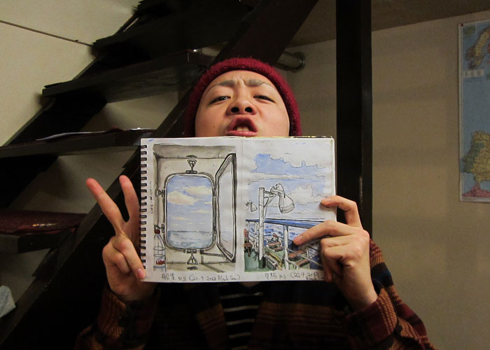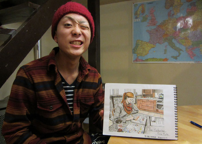 実はコータくんはお絵描き旅人。今はアンダンテの管理人でバタバタしているので、ここではあまり絵を描いていないようなのだが、ここに辿り着くまでの旅先で描いてきたという絵がつまったスケッチブックを見せてもらったところ、思わず目が釘付けにされてしまうほど上手い絵がみっちり描かれていまして。