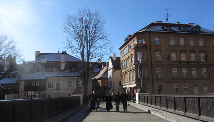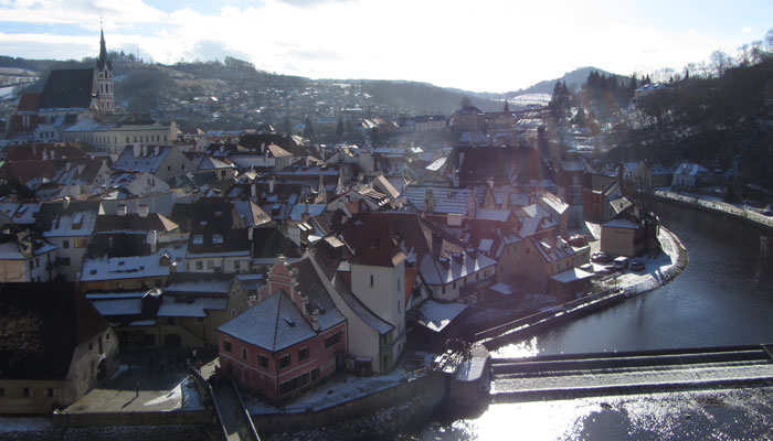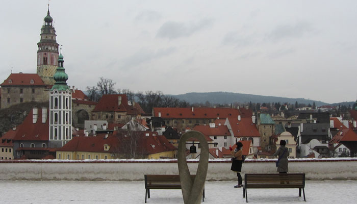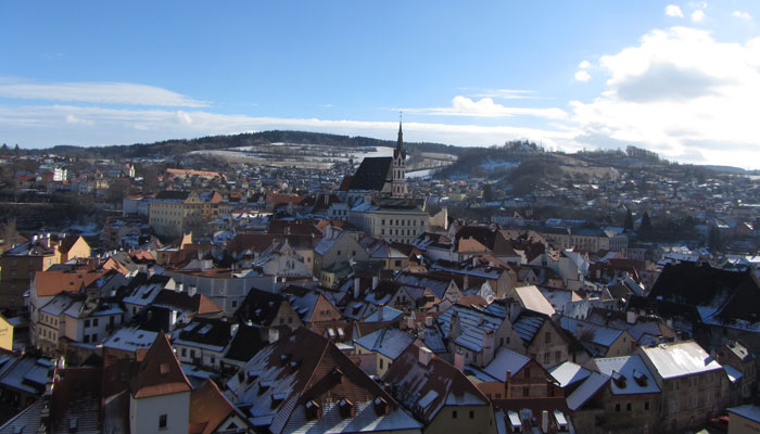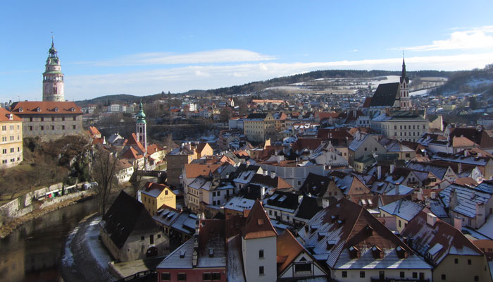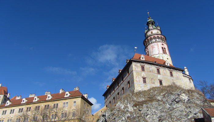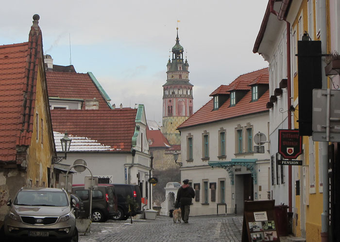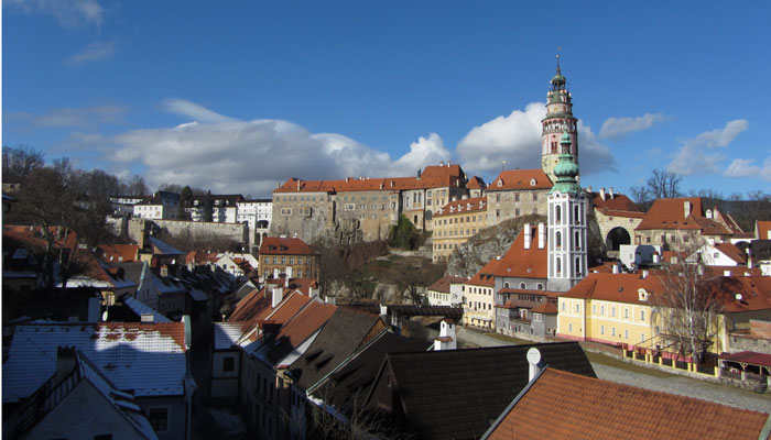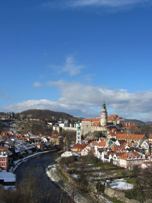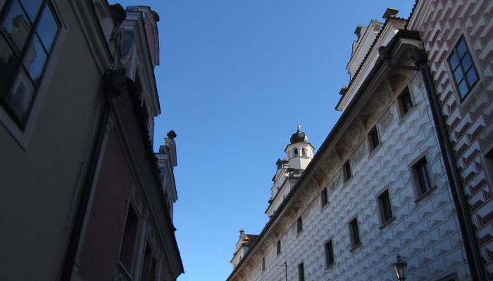 昨日到着して以来、ずっと雲がはりっぱなしだったチェスキークロムロフの空だったのだが、朝からチェコ名産のピルスナービールを飲みながらの朝食をすませ、レストランから出たら、すっかり青空になっていた。青空の下でのチェスキークロムロフの町は、さらにメルヘンチック度合いが上がってしまった。うむむ、やっぱりココは、男一人旅で来る町じゃないですわ。