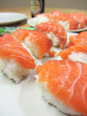 コータくんとミズキちゃんと一緒にサーモン寿司三昧な本日の夕食でした、ハイ。