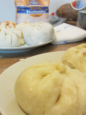 蓋についた蒸気が垂れてしまわないように、蓋にタオルをまいて鍋にかぶせる。で、蒸すこと十五分。そろそろできたかな、と蓋を開けたら・・・見事に膨らんだ肉まんが出来上がってた。