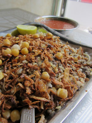 で、運ばれてきたコシャリとは・・・パスタやら豆やらを盛ってそこにトマトベースのソースをかけて食べるものだった。オシャレじゃないパスタっていうか、不健康ではないジャンクフードっていうか・・・まぁ、B級グルメ感あふれる食べ物でして。