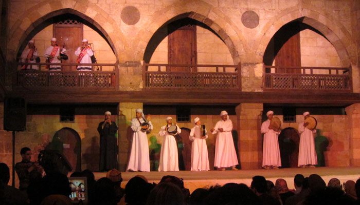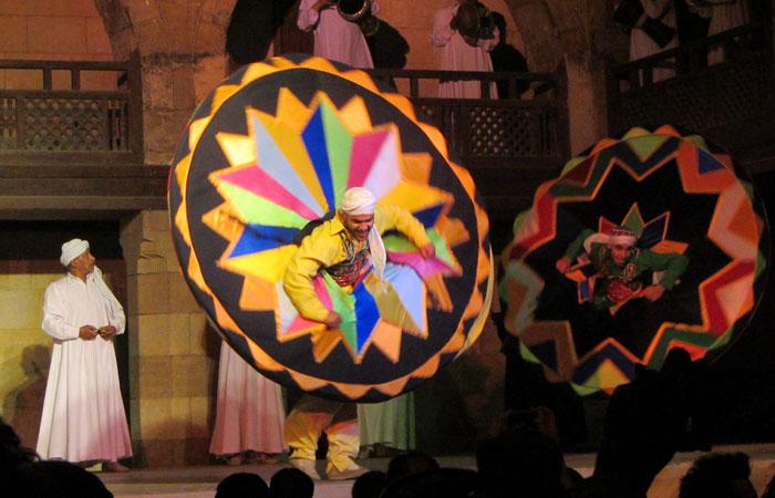 結構人だかりができている<スルタンゴーリーの隊商宿>前の野外ステージに到着。意外と人気があるらしい。と、まずは楽器を持った白装束の人たちが出てきた。この感じはイスタンブールで見たのと同じだったのだが・・・演奏し始めた音楽が、予想に反してかなりのアップテンポ。イスタンブールのスーフィーダンスは、緩やかで、非常におごそかで、そのおごそかな中でくるくる回る人たちが幻想的だったのだが・・・ここカイロのスーフィーダンスは、おごそかなんて言葉は微塵も当てはまらない。くるくる回るダンスという意味では共通点があるのだが、こちらはとにかく激しく華やか。衣装もカラフルなものが多く、見た目が派手。そう、見世物として、昇華させた感じなのだ。