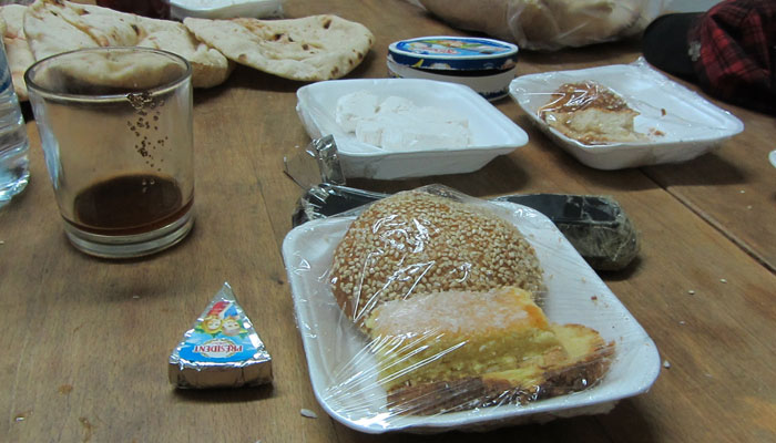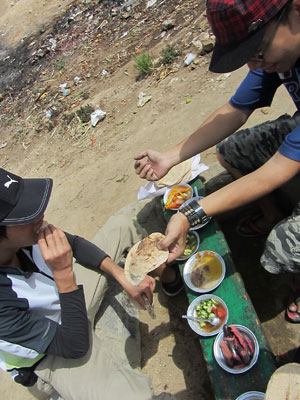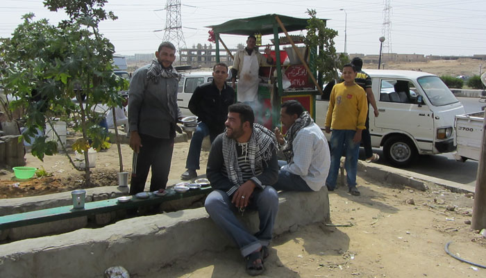 そんなこんなで喧噪のカイロの街を抜け、ギザの街でピラミッドに再会した後、そこから砂漠ロードへ突入。と、その前に、砂漠に入ると、なにもなくなる可能性があるから、ということで、腹ごしらえ。