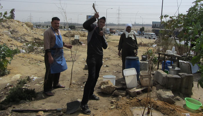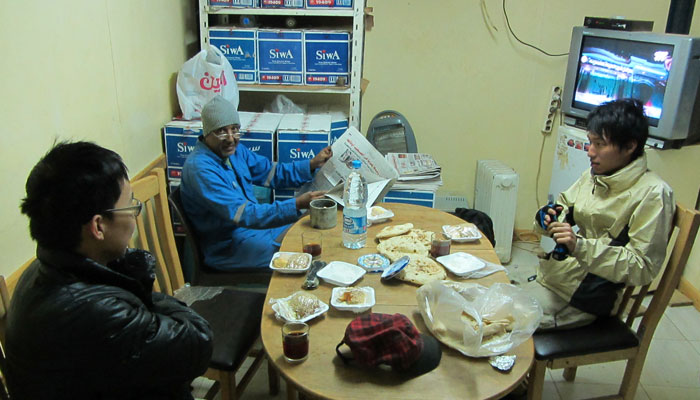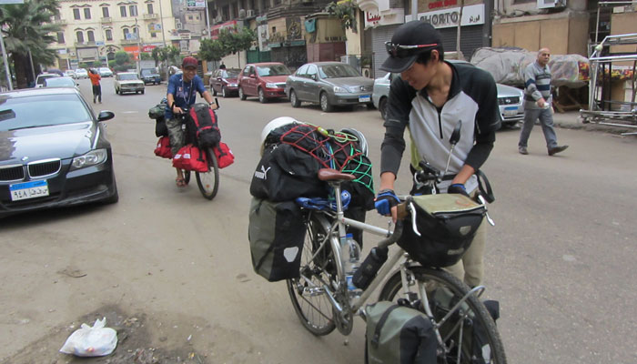 と、走り始めたオイラたち。が、実はチャンくんはチャリダー初心者。ユーラシアをチャリで横断してきた森くんと、この宿で出会い、そんな森くんの話を聞いているうちに「エジプトのカイロから走り始めてアフリカを縦断したい」という気持ちになっちゃったチャン。思い立ったら気持ちが抑えきれなくなり、カイロで装備をそろえて準備を始めちゃったのだ。ということで、森くんとチャンくんは、新しく購入したチャンくんの自転車を旅用に調整するために、ずっとカイロに滞在してて。で、そこへオイラが割り込んだっていう流れだったんですわ。
