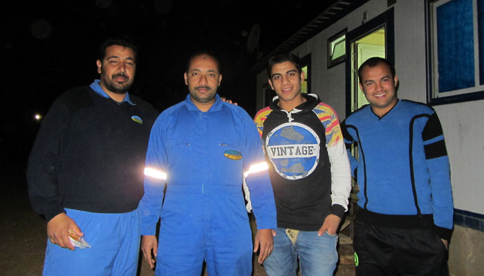 さて、夕刻になってきたので、そろそろ走り終えるか、ってな話になったのだが、なんせ、ここは砂漠の中。宿がある町はあと3日くらい走らないと辿り着かない。初日から砂漠のど真ん中にテント泊か・・・と思っていたら、プレハブの建物がいくつか並ぶなにかの作業所みたいなところを発見。砂漠のど真ん中にテントを張るより、建物脇にテントをはらせてもらったほうがいい、ということで、お願いして、プレハブ脇にテントを張らせてもらうことに。