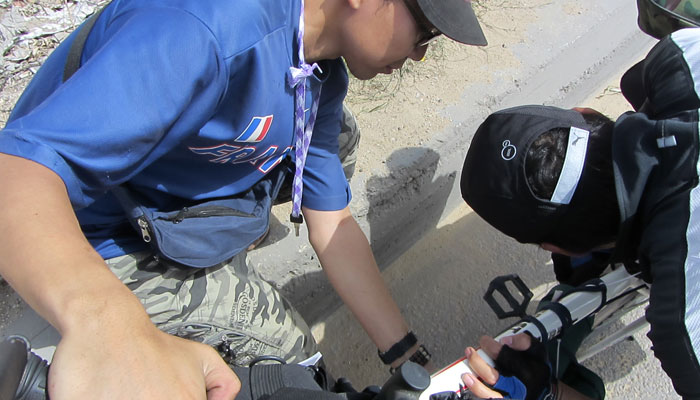 で、パンクを直して、二人に追いつくべく、ちょい急ぎこぎで走ってたら・・・またまた自転車の不具合を調整しているチャンくんと森くんに追いついた。