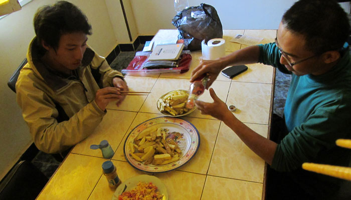 さて、オアシス停滞中、オイラはパソコン、チャンくんはスマートフォンを持っていて、それぞれ作業モードに入ることがあるのだが、森くんは、パソコンを持っていない。なので、まぁ、作業モードはそこそこにして、3人で話をする時間をとることが多い。実は、森くん、旅当初はパソコンを持っていたそうな。しかし、パソコンがあると、ひたすらネットしてしまう自分に嫌気がさし、「こんなことをするために旅に出たんじゃない!」と、思い切ってパソコンを日本に送り返してしまったとのこと。なるほど、オイラも、そんな思いに駆られる時はあるのだが、オイラの場合は、旅の記録を作ることが旅の楽しみの一つでもあるため、パソコンは手放せない。今の旅体験と、記録の旅体験は違うもの。二つの旅を存分に味わいたいオイラなので。しかし、まぁ、パソコンがないと、<今の旅時間>が増えるのは確か。記録旅体験を重要視していない人は、パソコンなんて持っていかないほうがいいのかもな、と森くんを見て思わされるのでした、はい。