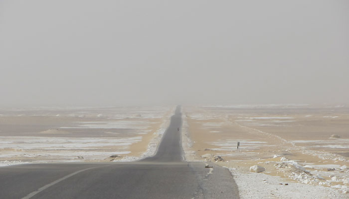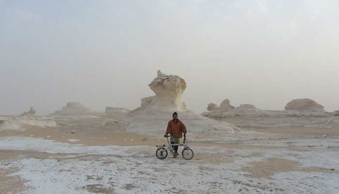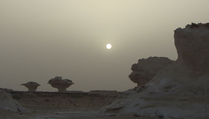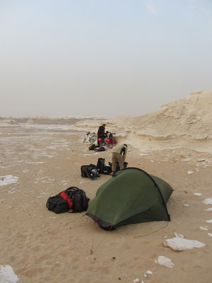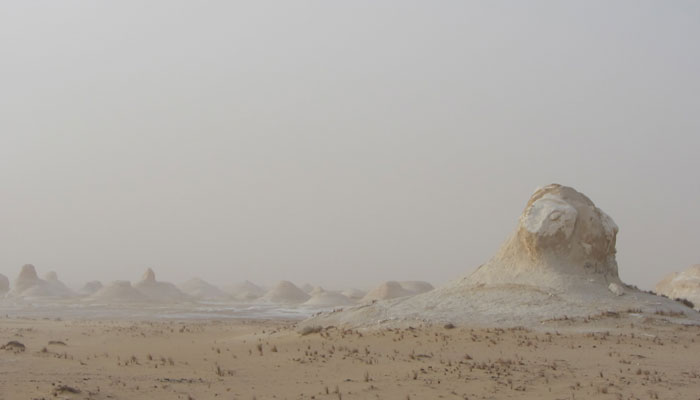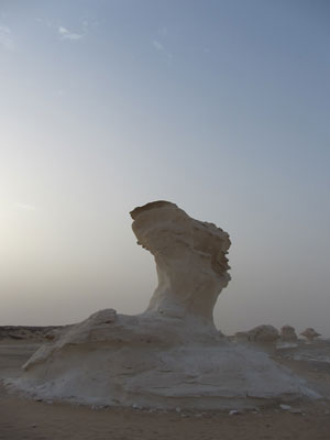 本日、朝起きて、白砂漠で奇岩をバックに記念撮影。しかし、今日も風が強くて、その風のせいで、砂塵が飛びまくり、靄がかっていた。まぁ、これはこれで、雰囲気があるからいいか。
