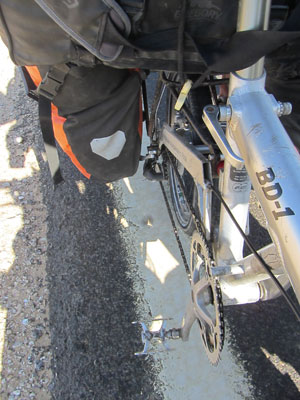 さて、シンドイながらも、走り自体は順調・・・と言いたいところなんですが、実は、後輪から異音が発生するようになってきちゃっているんですよ。今までに聞いたことがないような異音なので、めっちゃ気になる。が、音の原因を調べようとして、止まってタイヤだけまわしても音はしない。荷物を載せた状態で、しばらく走ると、相棒が変な異音を奏で始めるのだ。