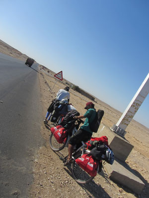 ずっと砂漠のど真ん中を走ってきたのだが、ようやくナイル川が近い地域にやってきた。砂漠道も相変わらず続くのだが、ナイル川沿いの道へ行くこともできる。今日朝には、ナイル川沿いの道へ続く分岐路が出現してきた。「砂漠道ばかりを走るのも、そろそろ飽きてきたから、ナイル川沿いに行ってみようか?」と、3人で申し合わせたように言葉が出た。