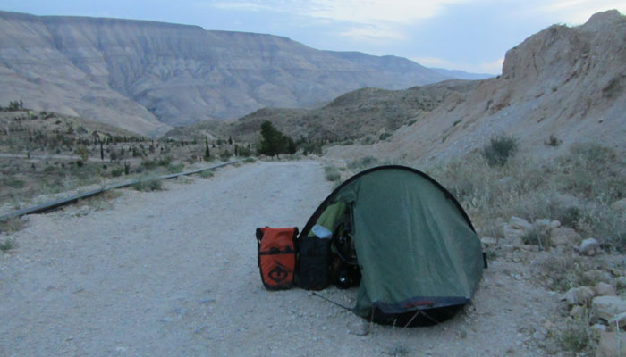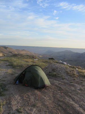 この最難関はあまりにもキツ過ぎた。対岸の丘の上に登ってから本日終了とするつもりだったのだが、登りがしんどすぎて、途中でダウン。登り切ることなく、丘の途中でテント泊。