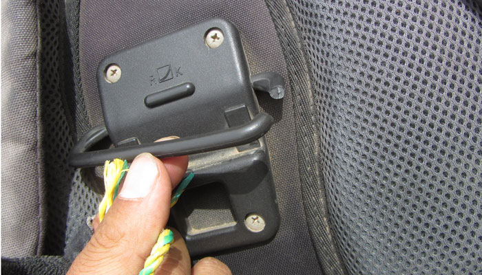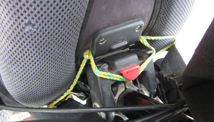 そんなアップダウンが負担だったのか、途中で、フロントバックのアタッチメントのプラスティックが突然折れた。まぁ、これは、これまで何度も折れたことがある箇所なので、いずれこうなることは分かっていた。慌てることなく手持ちの紐で応急処置。