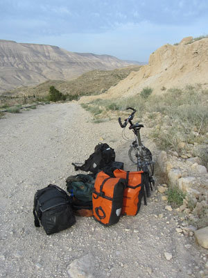 眼下に広がる死海へ行くワケなので、基本的には下り道。ここからは、下るだけでいいから楽っしょ、と思って挑んだのだが、ところがどっこい、この下り坂がめっちゃ急過ぎで。ほどよい勾配の下り坂は心地いいのだが、勾配が急すぎる坂は、返って大変。というのも、オイラの相棒BD-1が、下り坂ですぐパンクしちゃうんですわ。勾配がきつい下り坂では、どうしてもブレーキを多用しなくちゃいけなくて。で、小径車は車輪が小さい分、リムがブレーキパットとの摩擦で熱を帯びやすい。その熱でタイヤが歪み、そこへ荷物の重みが加わると、中のチューブに変な負担がかかって、結果パンクしてしまうんですわ。