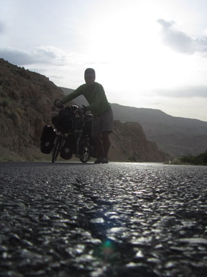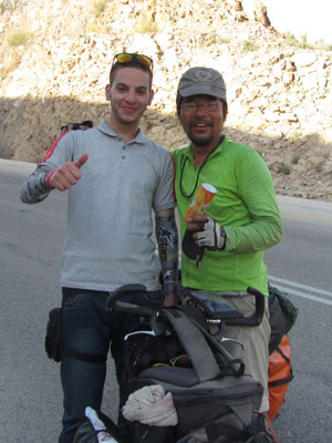 昨日から続く谷越が大変で、今日も早速登りから始まる。キングスハイウェイはホントキツイ。とりあえず最難関の崖丘は登り切り、町に到着したので、サンドイッチで腹ごしらえ。と、その町からちょっと走った所の道脇で集まっていたおじさんたちから声をかけられた。