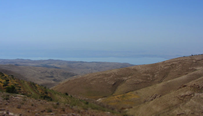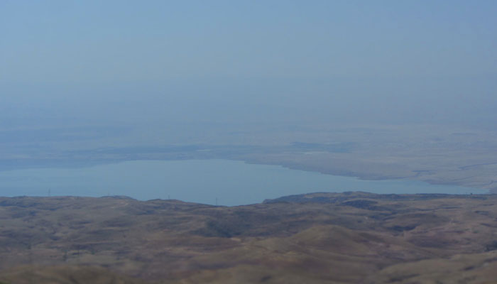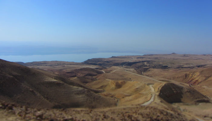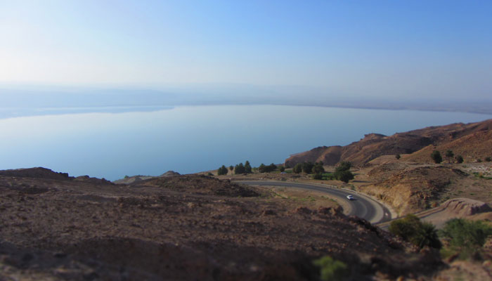 お腹いっぱいお肉をご馳走してもらいおじさんたちにお礼を言って別れ、再び走り始める。しばらく走ったら、眼下に湖らしきものが見えてきた。有名な死海だ。