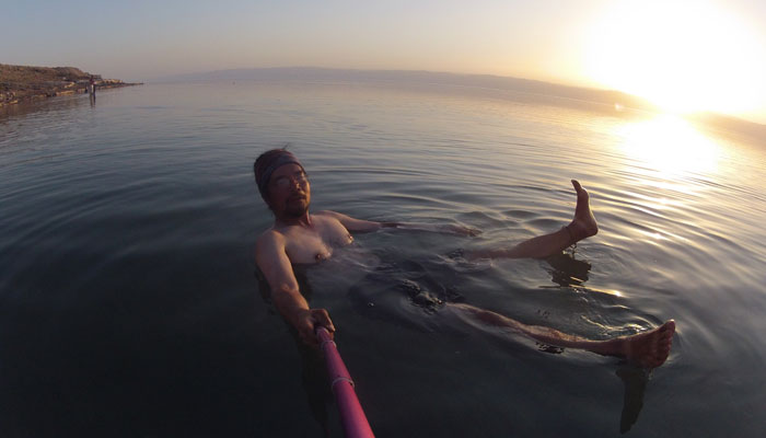 早速水着に着替え、死海へ。恐る恐る足をいれる。この時点では特に変わったことは起こらない。意外と普通の湖なんじゃね?と思いながら、全身を湖に漬けると・・・体がポカリと浮かんだ。