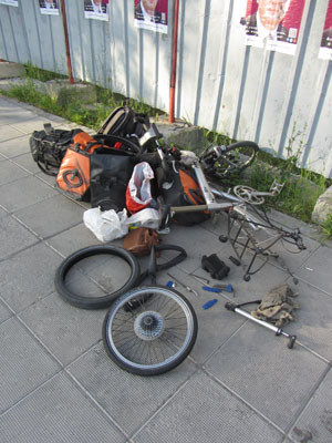 さて、国境のところへ来たら、前方からバックパックを背負って歩いてくる人がいた。スタイルからして、ずっと歩きっぱなしな感じ。これは、ひょっとして噂に聞く徒歩ダーって人なのか!?と思って、話しかけてみたところ、韓国人の旅人で、韓国から、ずっと歩いてユーラシア大陸を旅しているとのこと。いやぁ、歩きかぁ・・・笑顔で話してくれる彼の歩き旅の話を聞いてても、面白そうだとは思うものの、歩き旅はやってみたいとは思わないんだよなぁ(短距離ならまだしも、ずっとは)・・・チャリ旅のオイラでも、歩き旅をやっている人の気持ちはちとワカラナイ。あ、ひょっとしてこの感覚はバックパック旅をしている人が、チャリダーに抱く気持ちと同じものなのかもしれない。