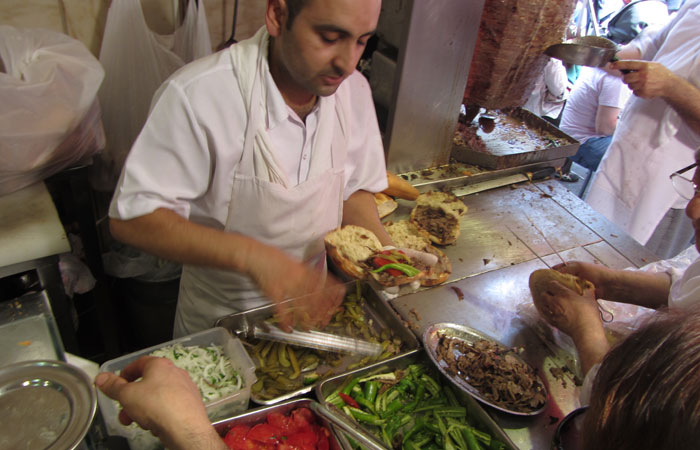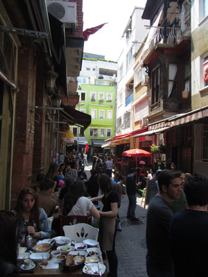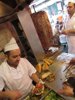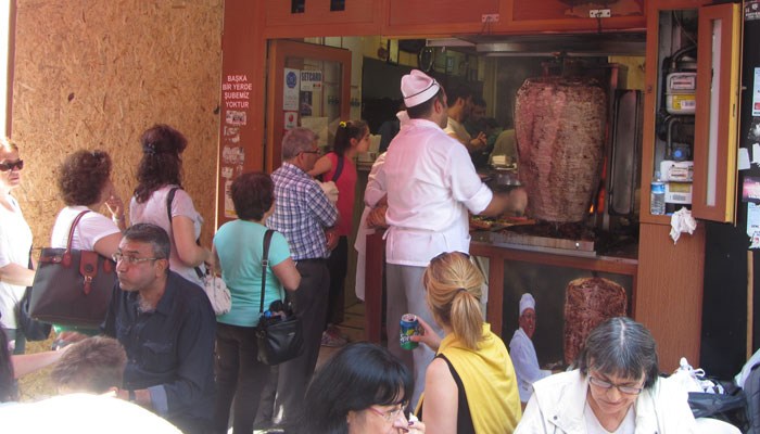 朝、伊藤くんが「この近くにイスタンブールで一番おいしいドネルケバブ屋があるらしいんですよ」というので、じゃぁぜひ、ということで、そのドネルケバブ屋へ朝飯を食いに行ってみることに。確かに、朝っぱらから行列ができるほど繁盛している店だった。ちなみに、店先に置いてあるまるまるとしたドネルがなんと一日で全部売れてしまうほどの人気店らしい。これは期待が持てる・・・とは思うものの、こういうのって期待しすぎるとよくない。ハードルあげちゃうと実際食べたら、まぁ、普通に美味しいくらいだな、ってなことになっちゃうことが多いからね。